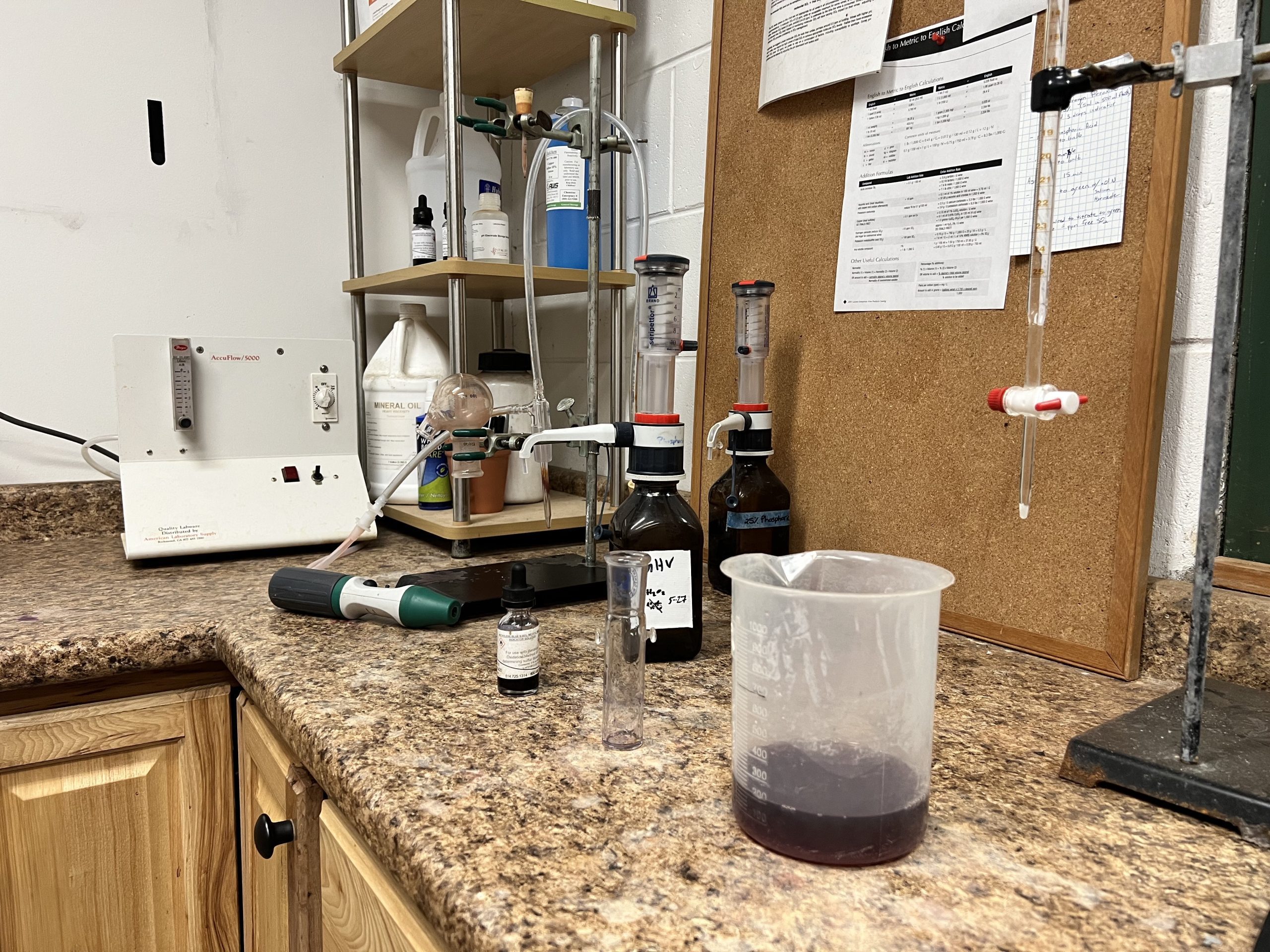At Aurora, our team does what is called the Air Aspiration/Oxidation Method. With this method, the SO2 is being separated from the wine to get a clean sample without interference from the other potential compounds, explains Baker. During this process, acid is added to the wine, which is then subjected to a positive pressure that separates molecular SO2 from the liquid. The gaseous SO2 passes through tubing to a second receptacle where it is then trapped by a hydrogen peroxide solution, forming sulfuric acid.